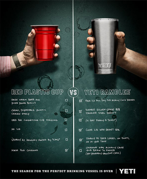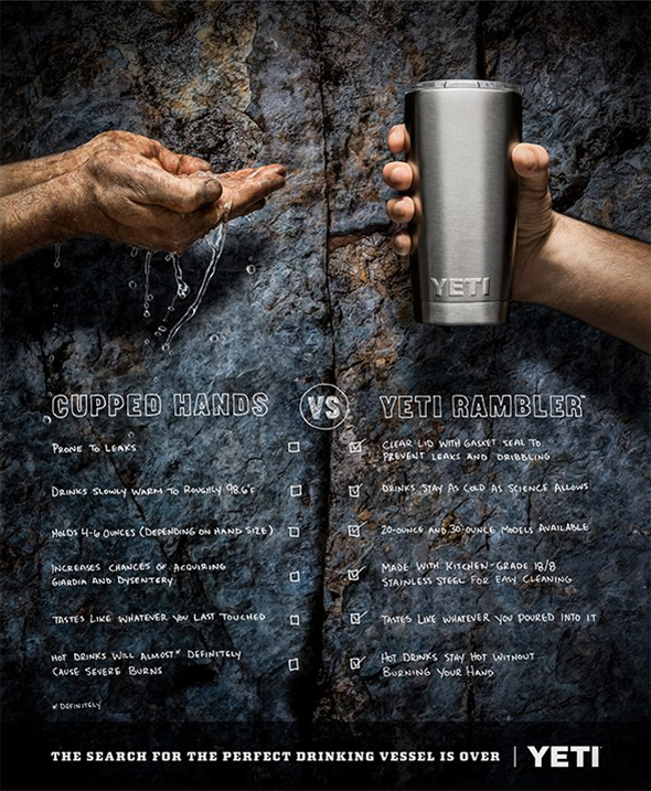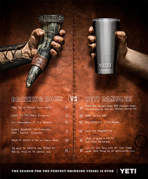 YETI partnered with McGarrah Jessee to create a print campaign which differentiated the YETI Rambler from a sea of knockoffs, in both features and brand ethos.